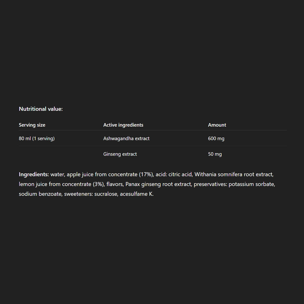 Il ASHWAGANDHA & PANAX GINSENG SHOT è la scelta ideale per chi affronta ogni giorno nuove sfide e desidera mantenere vitalità, concentrazione ed equilibrio interiore.