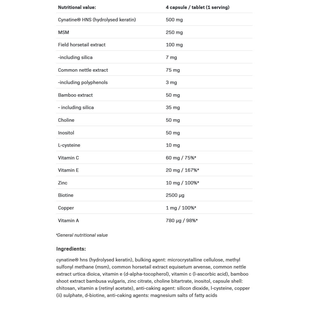 Questo non è un tradizionale integratore alimentare, ma un cosmetico professionale e nutriente che agisce dall'interno per aiutare a mantenere la condizione ottimale di pelle, capelli e unghie. Tra le altre cose, contiene una cheratina brevettata, altamente biodisponibile, prodotta da un produttore americano-francese e registrata con il nome Cynatine NHS.