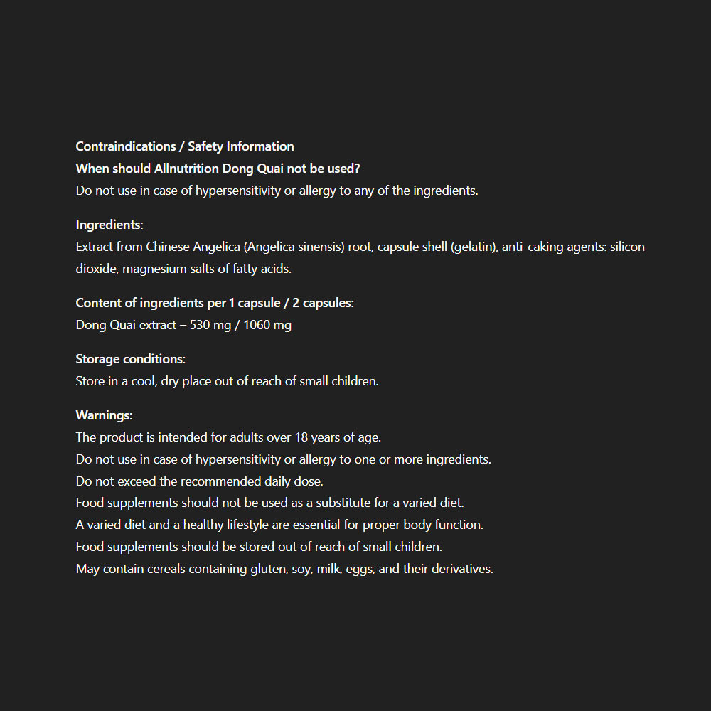 ALLNUTRITION DONG QUAI contiene 1060 mg di estratto di radice di dong quai nella dose giornaliera consigliata. L'integratore è disponibile in capsule facili da deglutire e supporta la salute delle donne durante le varie fasi del loro ciclo.