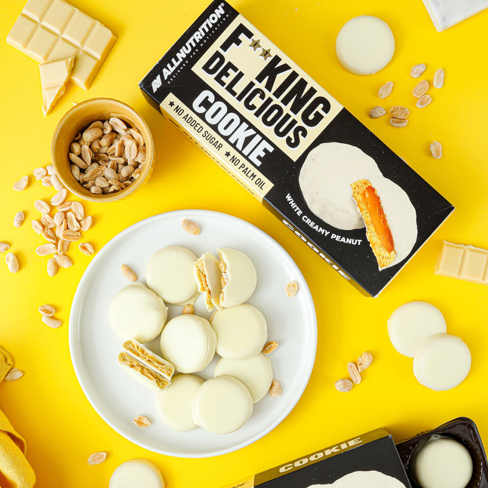 ALLNUTRITION FITKING DELICIOUS COOKIE WHITE CREAMY PEANUT sono fantastici biscotti friabili, realizzati senza zuccheri aggiunti né olio di palma!