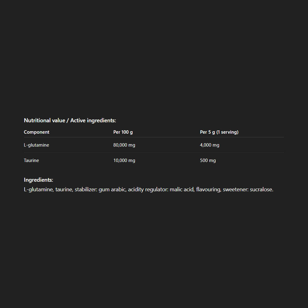 Supporta il recupero muscolare dopo l’allenamento con un’elevata dose di L-glutammina e taurina per atleti attivi