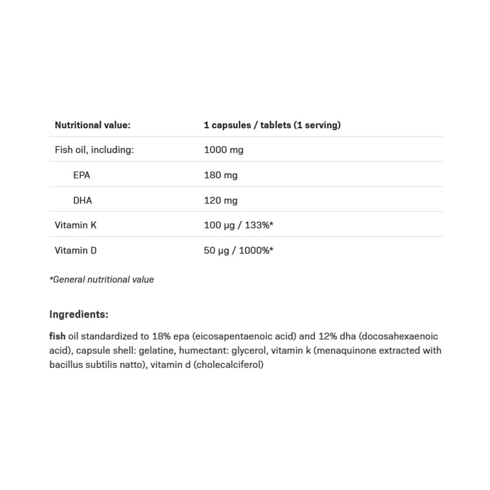 OMEGA 3 K2 D3 è la scelta ideale per chi desidera mantenere la salute di cuore, cervello e vista, rafforzare le ossa, sostenere il sistema immunitario e i muscoli e condurre uno stile di vita attivo.