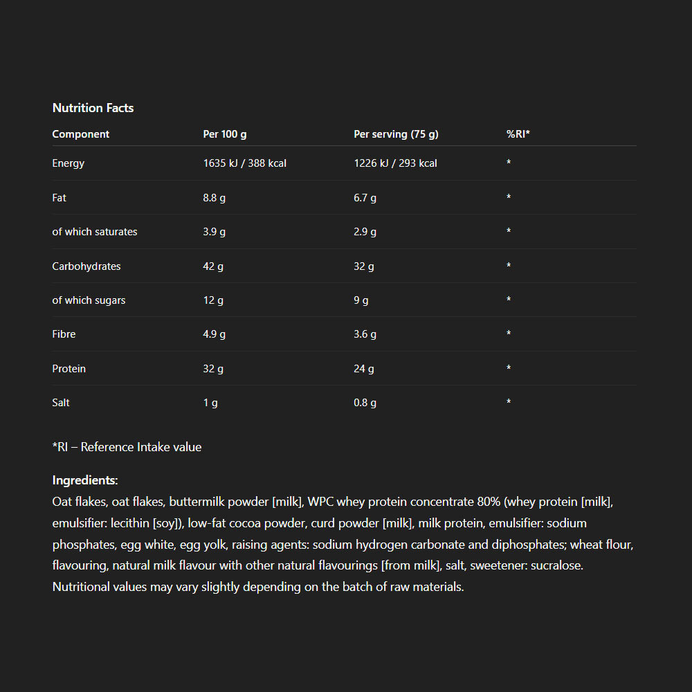 Mescola 75 g (3 misurini) del preparato con 75 ml di acqua o latte fino ad ottenere un composto liscio, lascialo riposare per 3–5 minuti, poi prepara 3–4 pancake e friggili in una padella ben calda e unta per 3–4 minuti, oppure usa una macchina per waffle (secondo le istruzioni del dispositivo)!