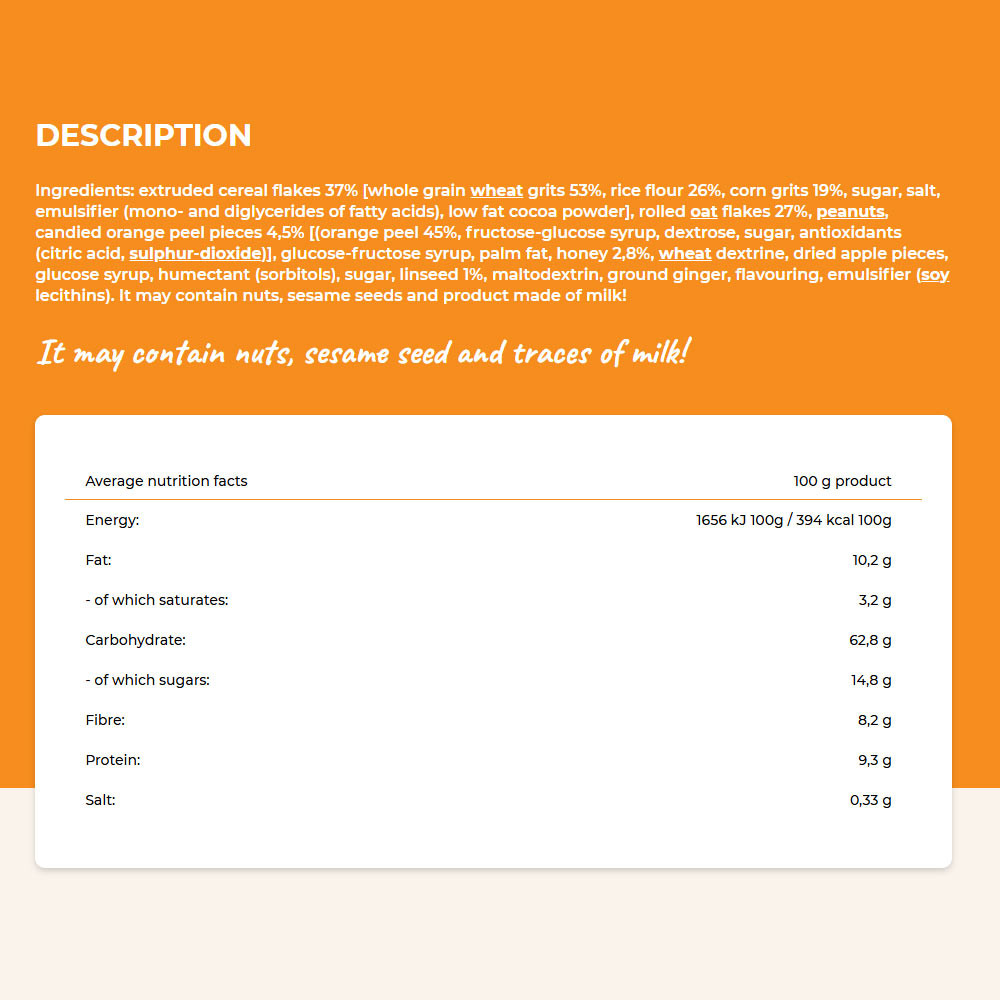 Ingredienti: fiocchi di cereali estrusi 37% [semola integrale di frumento 53%, farina di riso 26%, semola di mais 19%, zucchero, sale da cucina, emulsionante (mono- e digliceridi degli acidi grassi), cacao magro in polvere], fiocchi d’avena 27%, arachidi, scorza d’arancia candita a pezzi 4,5% [scorza d’arancia 45%, sciroppo di fruttosio-glucosio, destrosio, zucchero, antiossidante (acido citrico, anidride solforosa)], sciroppo di glucosio-fruttosio, grasso vegetale (palma), miele 2,8%, destrina di frumento, pezzi di mela essiccata, sciroppo di glucosio, umettante (sorbitolo), zucchero, semi di lino 1%, maltodestrina, zenzero macinato, aromi, emulsionante (lecitina di soia). Può contenere tracce di frutta a guscio, semi di sesamo e prodotti derivati dal latte!
