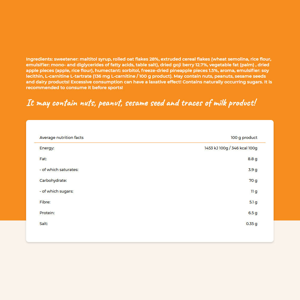 Ingredienti: edulcorante: sciroppo di maltitolo, fiocchi d’avena 28%, fiocchi di cereali estrusi (semola di grano, farina di riso, emulsionante: mono- e digliceridi degli acidi grassi, sale da cucina), bacche di goji essiccate 12,7%, grasso vegetale (palma), pezzi di mela essiccata (mela, farina di riso), umidificante: sorbitolo, pezzi di ananas liofilizzati 1,5%, aroma, emulsionante: lecitina di soia, L-carnitina L-tartrato (136 mg L-carnitina / 100 g di prodotto). Può contenere frutta a guscio, arachidi, semi di sesamo e latticini! Un consumo eccessivo può avere effetti lassativi! Contiene zuccheri naturalmente presenti. Si consiglia di consumarla prima dell’attività sportiva!