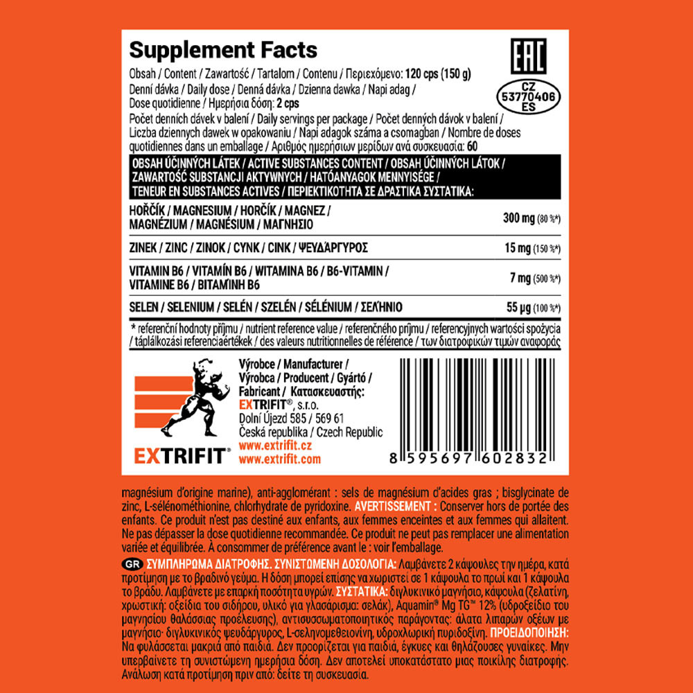Extrifit ZMB 6! Premium! 120 cps è un integratore alimentare in capsule. Contiene magnesio e zinco bisglicinati chelati insieme al marchio marino magnesio Aquamin® per un assorbimento ottimale. La composizione è completata da una dose extra elevata di vitamina B6 e selenio biodisponibile in forma di amminoacido per la massima utilizzazione da parte dell'organismo.