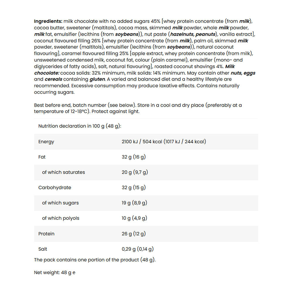 Ingredienti: cioccolato al latte senza zuccheri aggiunti 45% [concentrato di proteine del siero di latte (da latte), burro di cacao, edulcorante (maltitoli), massa di cacao, latte scremato in polvere, latte intero in polvere, grasso del latte, emulsionante (lecitine (da soia)), pasta di frutta secca (nocciole, arachidi), estratto di vaniglia], ripieno al gusto di cocco 26% [concentrato di proteine del siero di latte (da latte), olio di palma, latte scremato in polvere, edulcorante (maltitoli), emulsionante (lecitine (da soia)), aroma naturale di cocco], ripieno al gusto di caramello 25% [estratto di mela, concentrato di proteine del siero di latte (da latte), latte condensato senza zucchero, grasso di cocco, colorante (caramello semplice), emulsionante (mono- e digliceridi degli acidi grassi), sale, aroma naturale], scaglie di cocco tostate 4%. Cioccolato al latte: solidi di cacao: almeno 32%, solidi di latte: almeno 14%. Può contenere altra frutta a guscio, uova e cereali contenenti glutine. Si raccomanda una dieta varia ed equilibrata e uno stile di vita sano. Il consumo eccessivo può avere effetti lassativi. Contiene zuccheri naturalmente presenti.