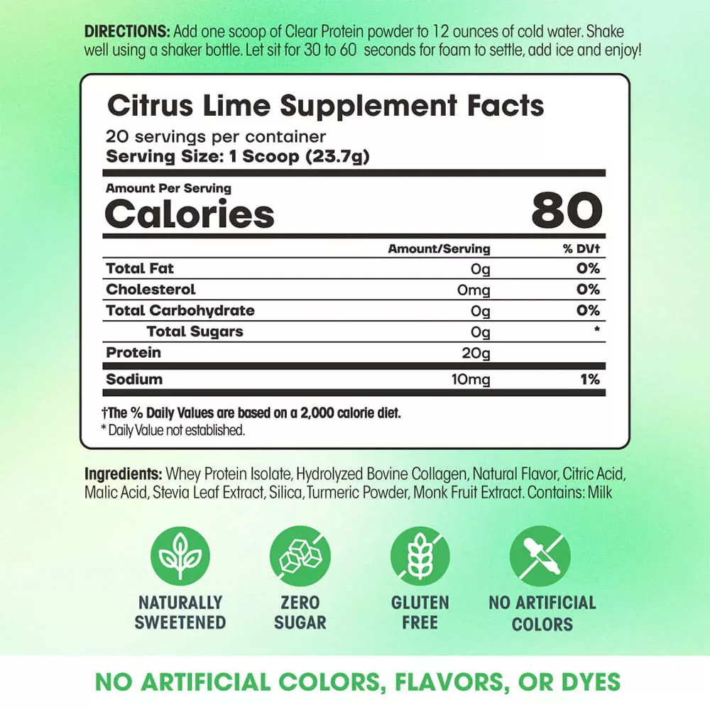 Aggiungi una (1) misurino di Clear Protein in polvere a 12 once di acqua fredda. Agita bene utilizzando una borraccia shaker. Lascia riposare per 30-60 secondi per far assestare la schiuma, aggiungi ghiaccio e gusta!