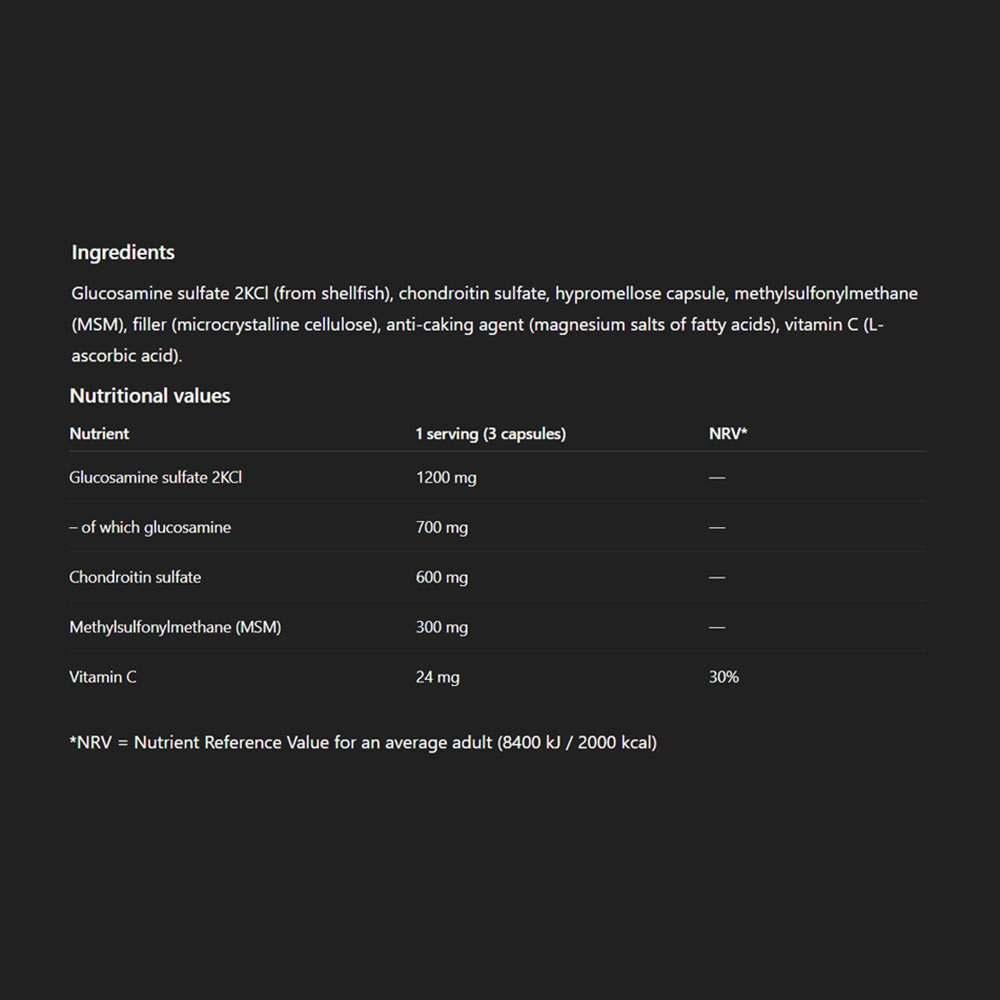 • contiene glucosamina, condroitina, MSM e vitamina C