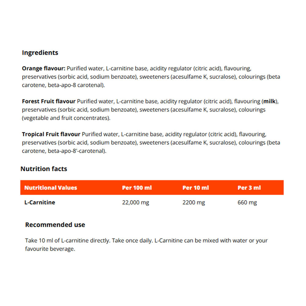 L-carnitina è una sostanza che si trova naturalmente nel nostro corpo ed è presente anche in una dieta ben formulata e razionale. Le fonti includono carne, pesce e latticini, ad esempio. Poiché la carnitina si trova principalmente negli alimenti di origine animale, l'integrazione può essere particolarmente utile per le persone che non la includono nella loro dieta. Questa L-carnitina ha il vantaggio di essere in forma liquida concentrata, dalla quale puoi preparare in pochissimo tempo una bevanda alla frutta rinfrescante.