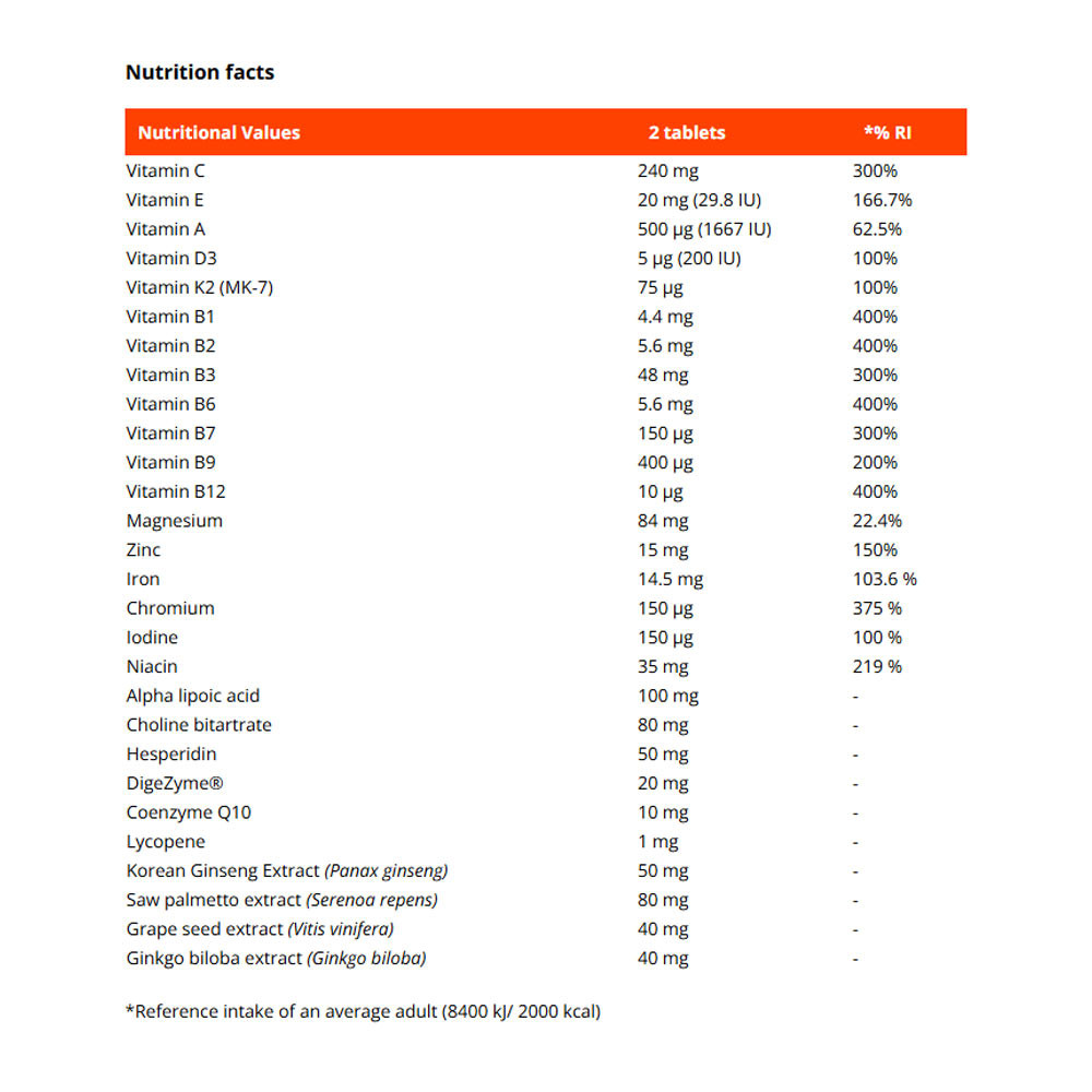 Contribuisce inoltre alla fertilità e alla normale funzione riproduttiva o cognitiva, che comprende memoria, concentrazione e attenzione. La formula include anche la vitamina A, che favorisce il mantenimento di una buona vista, e la vitamina E, che contribuisce alla protezione delle cellule dallo stress ossidativo. Successivamente troviamo il ferro, che contribuisce al normale metabolismo importante per la produzione di energia e il corretto trasporto dell’ossigeno nel corpo. C’è anche lo iodio, che contribuisce alla corretta produzione degli ormoni tiroidei e al normale funzionamento della ghiandola tiroidea. Vale anche la pena menzionare che la vitamina D presente è nella forma D3 (colecalciferolo) e la vitamina K2 (MK-7), nota anche come menachinone.