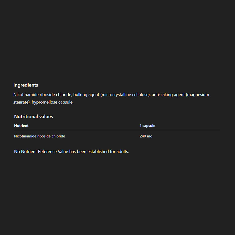 Nicotinamide riboside (precursore NAD ) è una forma di vitamina B3, dalla quale l'organismo produce il coenzima NAD (nicotinammide adenina dinucleotide). Quest'ultimo si trova in ogni cellula del nostro corpo. Come integratore alimentare, è adatto ad atleti, persone attive, individui con uno stile di vita impegnativo e biohacker. Questo prodotto è disponibile in pratiche capsule, il che lo rende facile da assumere e adatto anche a vegani.