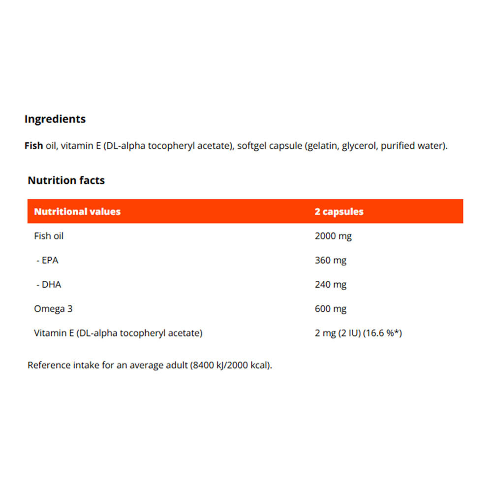Omega 3 contiene olio di pesce, che è una fonte degli acidi grassi essenziali eicosapentaenoico (EPA) e docosaesaenoico (DHA). Sia EPA che DHA contribuiscono alla normale funzione del cuore. Per ottenere questo effetto, è necessario assumere 250 mg di EPA e DHA al giorno, cosa che si può ottenere con questo integratore in 2 capsule. Il DHA da solo, inoltre, supporta il mantenimento della normale funzione cerebrale e della salute della vista, con un apporto giornaliero totale di 250 mg di questa sostanza.