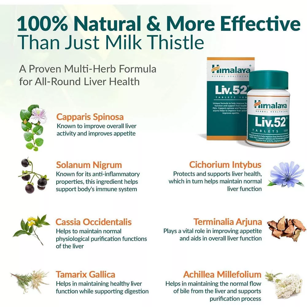 L'uso di Himalaya Liv.52 (LiverCare) può aiutare a regolare i livelli degli enzimi e ottimizzare l'assimilazione e migliorare l'efficienza funzionale del fegato. Liv.52 (LiverCare) aiuta a ripristinare l'efficienza funzionale del fegato proteggendo il parenchima epatico e favorisce la rigenerazione epatocellulare. Favorisce l'eliminazione rapida dell'acetaldeide, il metabolita intermedio tossico del metabolismo dell'alcol, e aiuta a garantire la protezione dai danni epatici indotti dall'alcol. Liv.52 (LiverCare) aiuta a ridurre l'attività lipotropa nell'alcolismo cronico e previene l'infiltrazione grassa del fegato. In condizioni pre-cirrotiche, Liv.52 (LiverCare) aiuta ad arrestare la progressione della malattia e a prevenire ulteriori danni al fegato. Come integratore quotidiano, Liv.52 (LiverCare) aiuta a migliorare l'appetito, i processi di digestione e assimilazione e favorisce l'aumento di peso.