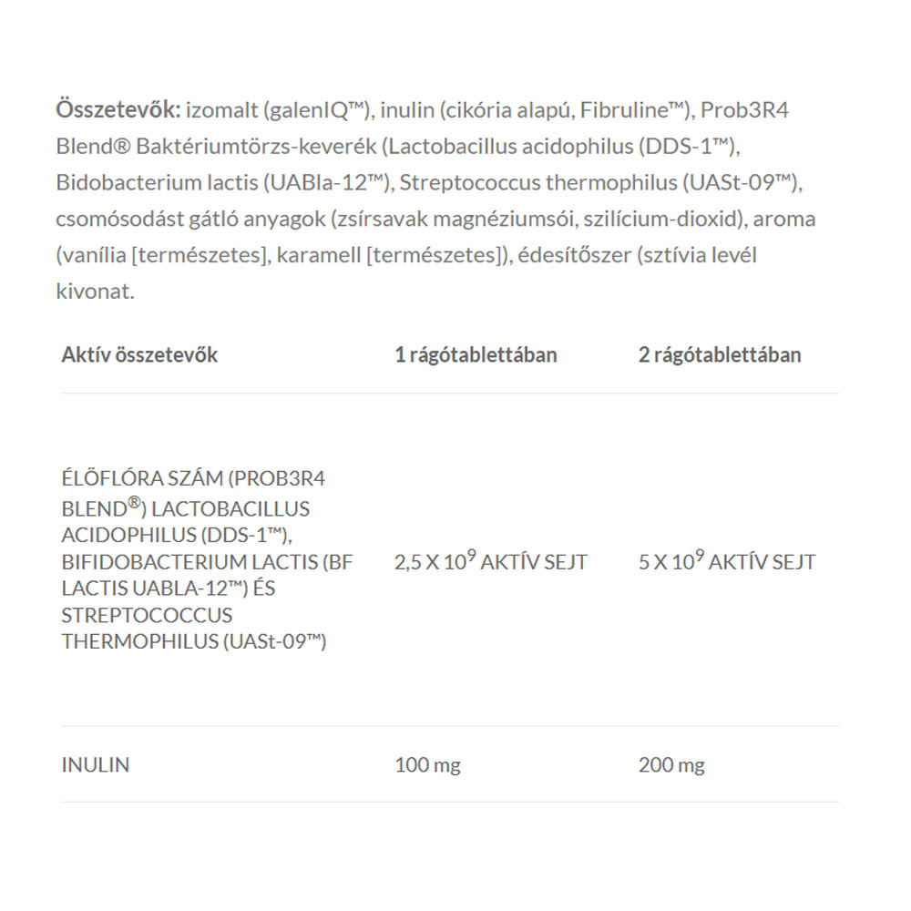 JutaVit Probium Kid per bambini + Inulina è un integratore alimentare a base di Lactobacillus acidophilus (DDS-1™), Bidobacterium lactis (Bf lactis UABla-12™), Streptococcus thermophilus (UASt-09™) e Inulina, con un piacevole aroma naturale di vaniglia e caramello e un edulcorante.