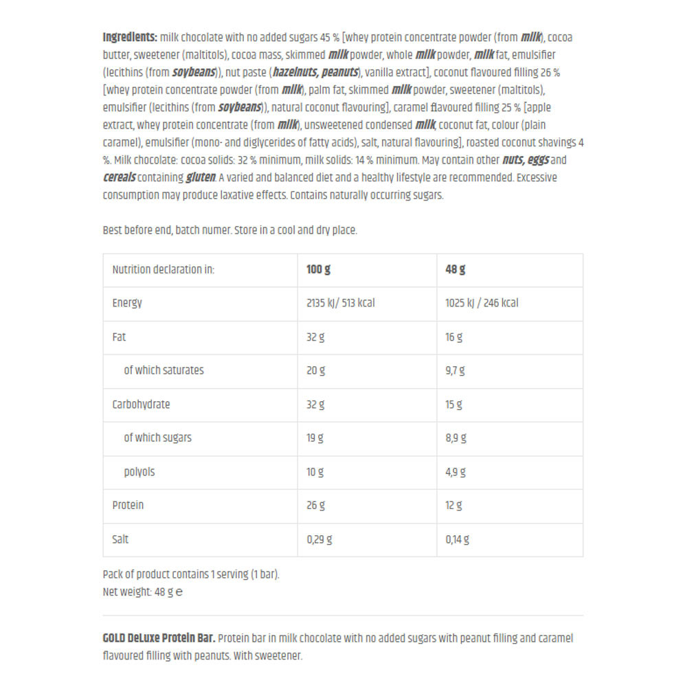 Ingredienti: cioccolato al latte senza zuccheri aggiunti 45% [concentrato proteico del siero di latte (da latte), burro di cacao, edulcorante (maltitoli), pasta di cacao, latte scremato in polvere, latte intero in polvere, grasso del latte, emulsionante (lecitina di soia), pasta di frutta secca (nocciole, arachidi), estratto di vaniglia], ripieno al gusto di cocco 26% [concentrato proteico del siero di latte (da latte), grasso di palma, latte scremato in polvere, edulcorante (maltitoli), emulsionante (lecitina di soia), aroma naturale di cocco], ripieno al gusto di caramello 25% [estratto di mela, concentrato proteico del siero di latte (da latte), latte condensato senza zuccheri aggiunti, grasso di cocco, colorante (caramello semplice), emulsionante (mono- e digliceridi degli acidi grassi), sale, aroma naturale], scaglie di cocco tostate 4%. Cioccolato al latte: min. 32% cacao, min. 14% latte. Può contenere altra frutta a guscio, uova e cereali contenenti glutine. Si raccomanda una dieta varia ed equilibrata e uno stile di vita sano. Un consumo eccessivo può avere effetti lassativi. Contiene zuccheri naturalmente presenti.UTILIZZO (1 dose = 48 g)