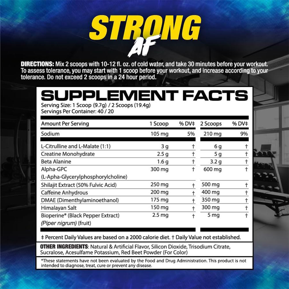 POTENTE PRE-WORKOUT: Formulato con ingredienti supportati da ricerche cliniche a dosaggi efficaci, STRONG AF sfrutta la sinergia multi-pathway per ottimizzare la forza muscolare, l’intensità dell’allenamento, la concentrazione cognitiva, l’energia, l’aumento del flusso sanguigno, il pump muscolare e il testosterone per massimizzare la prestazione, la crescita muscolare e il recupero.