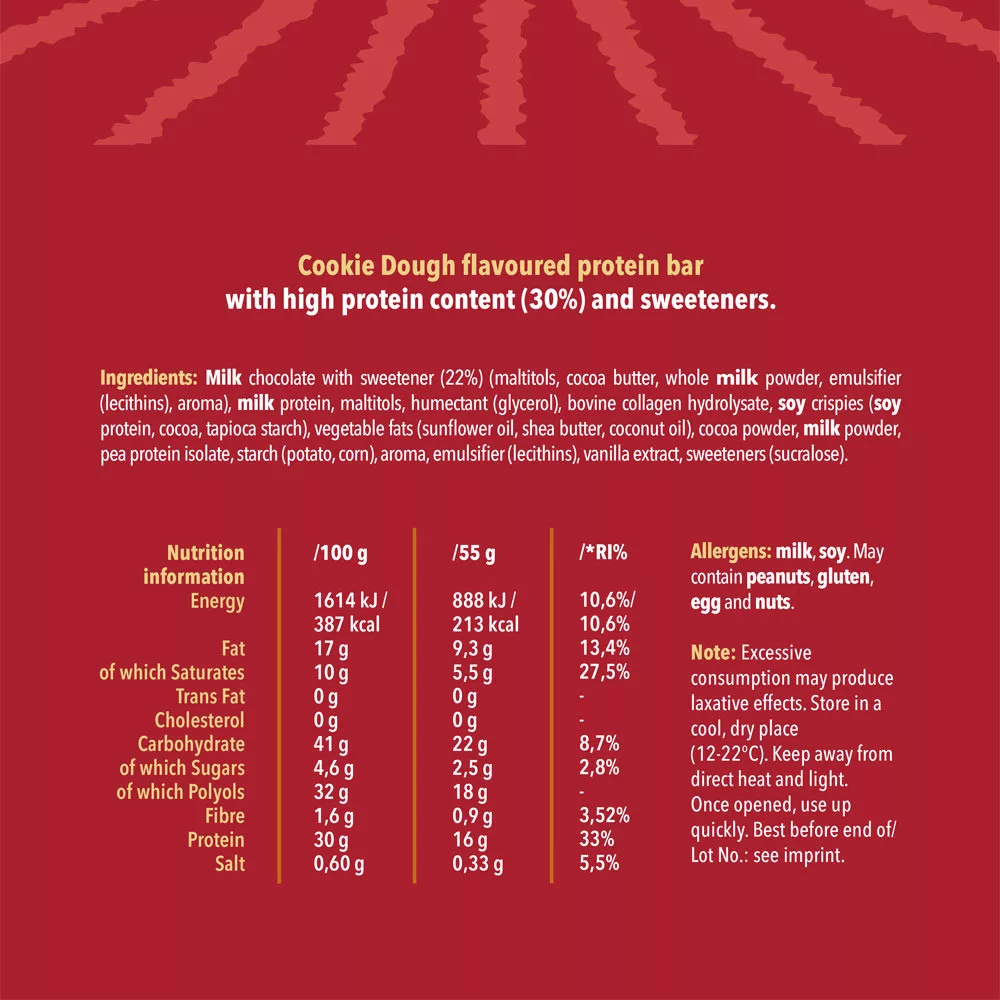 Il nostro Chunky Cookie Dough Protein Bar offre il ricco sapore di pasta per biscotti e 16g di proteine per darti energia durante la giornata.