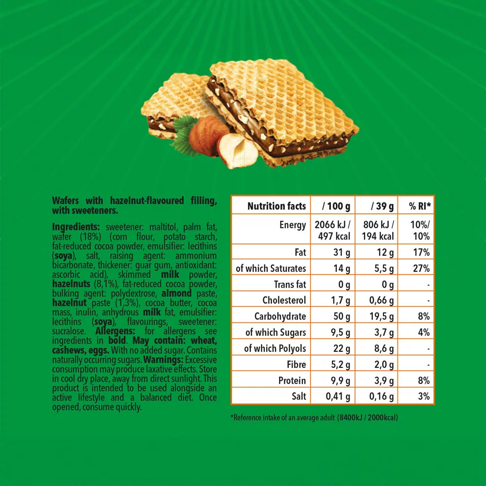 Deliziosi wafer croccanti ripieni di una morbida crema alle nocciole, pensati per chi desidera una dolcezza senza zuccheri aggiunti. Il prodotto contiene edulcoranti e zuccheri naturalmente presenti, offrendo così un'alternativa equilibrata ai dolci tradizionali. Perfetti come spuntino veloce durante la giornata, sia al lavoro, dopo l’allenamento o fuori casa. La combinazione di strati di wafer croccanti e ripieno cremoso alle nocciole offre una consistenza soddisfacente e un’esperienza di sapore ricca.