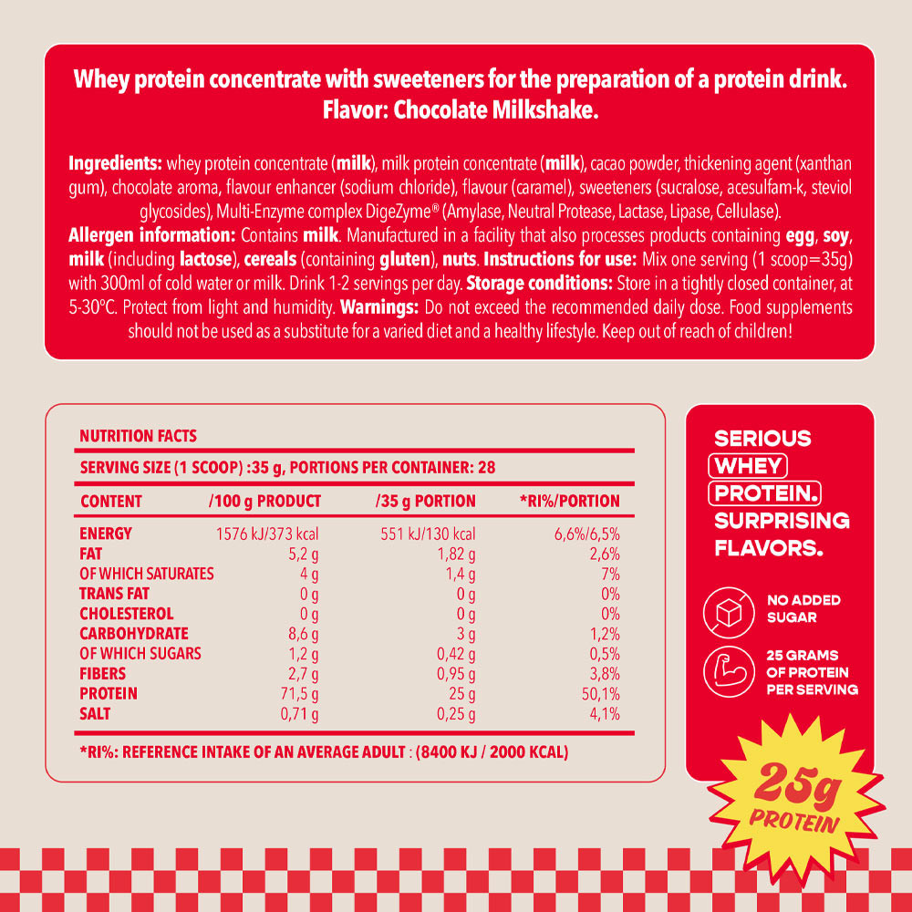 La dose giornaliera raccomandata indicata non deve essere superata. Non utilizzare come sostituto di una dieta variata. Conservare fuori dalla portata dei bambini piccoli. Conservare al riparo da calore, umidità e luce solare. Le proteine contribuiscono alla crescita della massa muscolare. Una dieta equilibrata e variata e uno stile di vita sano sono importanti. Contiene zuccheri naturalmente presenti. Secondo la prassi commerciale.