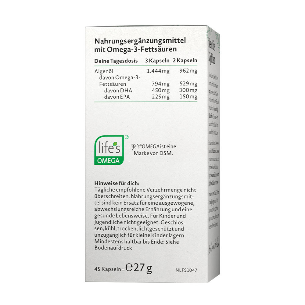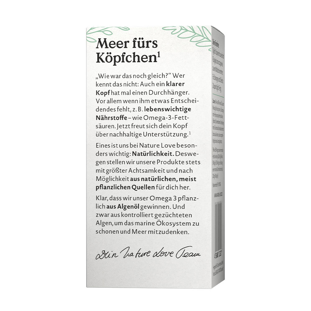 Non OGM"Com'era di nuovo?" Chi non conosce questa sensazione: anche una mente lucida può avere a volte dei vuoti. Soprattutto quando le manca qualcosa di essenziale, come nutrienti vitali – ad esempio gli acidi grassi omega-3. È proprio in questi momenti che la tua mente accoglie un sostegno sostenibile. Noi otteniamo i nostri omega-3 dalle piante, in particolare dall’olio di alghe. E da alghe coltivate con cura, per proteggere l’ecosistema marino e avere sempre a cuore l’oceano.