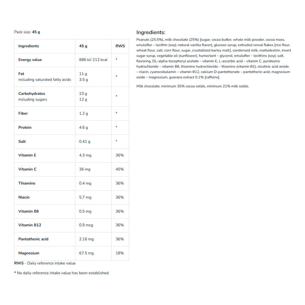 Perfetto prima o durante l’allenamento, oppure come snack energetico durante la giornata. Il suo formato compatto da 45 g lo rende facile da portare ovunque – al lavoro, a scuola, durante le escursioni o in palestra.