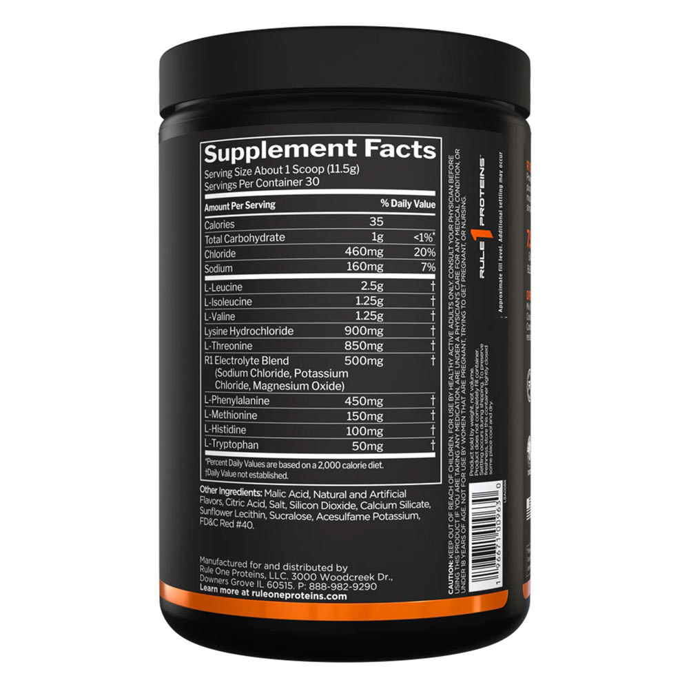 R1 Essential Amino 9 fornisce 7,5 g di tutti e 9 gli aminoacidi essenziali con l'aggiunta di elettroliti per l'idratazione.