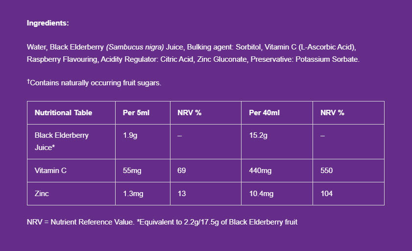 Una deliziosa vitamina a base di sambuco nero, vitamina C e zinco per un supporto immunitario per tutto l'anno per tutta la famiglia