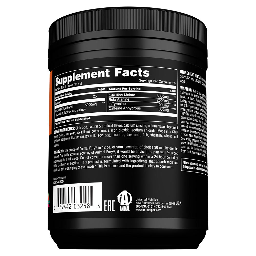 Mescolare un misurino di Animal Fury in 12 once. di una bevanda a scelta 30 minuti prima dell'allenamento. Data l'estrema potenza di Animal Fury, si consiglia di iniziare con 1⁄2 misurino e di arrivare a 1 misurino intero. Non consumare più di una dose nell'arco di 24 ore o entro 6-8 ore dal momento in cui ci si corica.