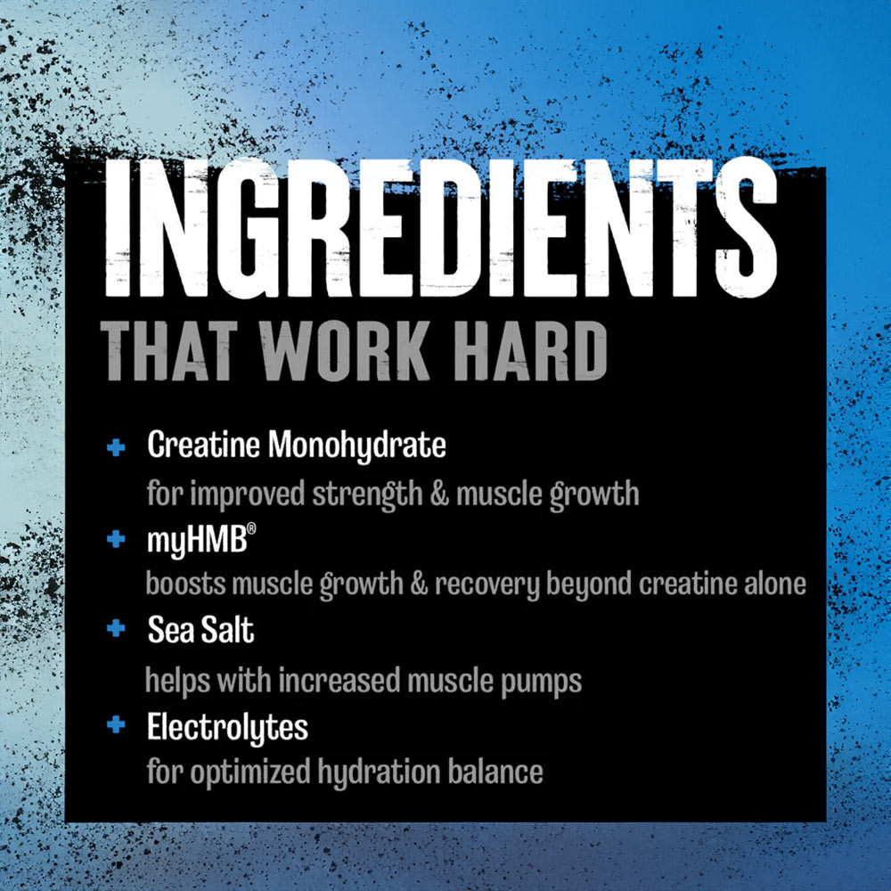 Fornisce 5 g di creatina 3 g di myHMB®, con elettroliti e vitamina D, forza amplificata e minore degradazione muscolare