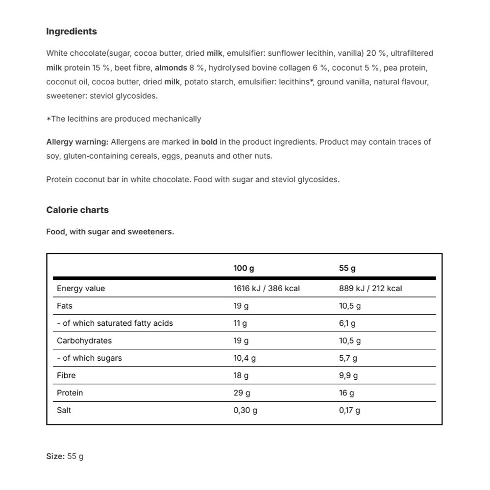 La barretta è ricoperta con cioccolato bianco della massima qualità. Il cioccolato ha un alto contenuto di cacao e contiene estratto naturale di vaniglia. È dolcificato con un edulcorante a base di stevia a basso contenuto calorico e una leggera nota di zucchero.