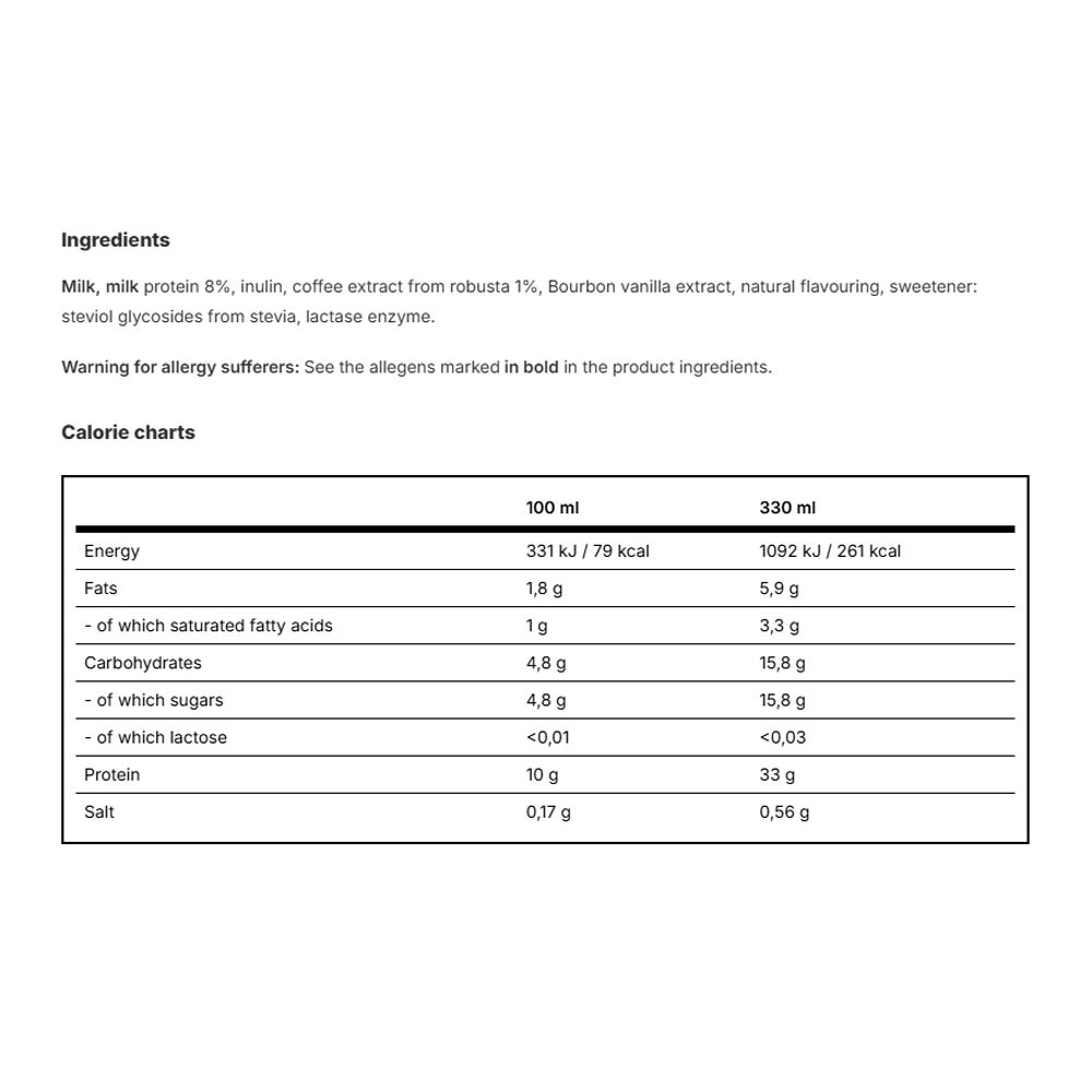 Il nostro caffè proteico è sia una bevanda rinfrescante, sia una sostanziosa fonte di nutrienti. È dolcificato esclusivamente con glicosidi steviolici a basso contenuto calorico, e il latte utilizzato è senza lattosio—il risultato è un contenuto di zucchero inferiore e una digestione più facile.