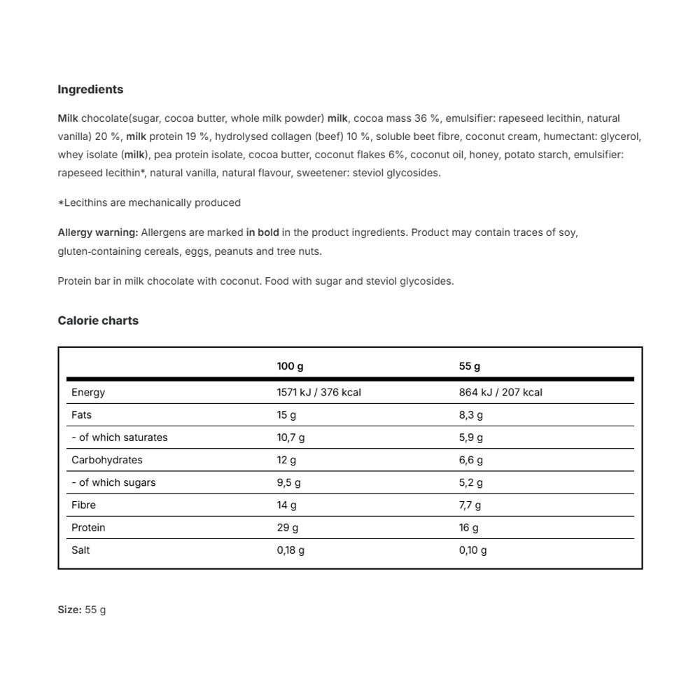 Per il massimo piacere delle tue papille gustative, abbiamo combinato cocco grattugiato con lussuoso burro di cocco e una generosa porzione di proteine complete. Come bonus, l’intera barretta è ricoperta di cioccolato al latte di alta qualità.