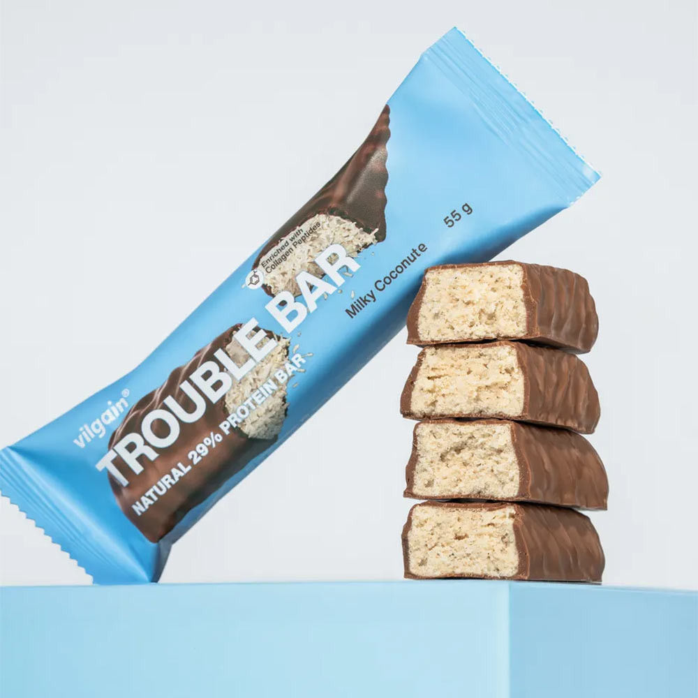Non lasciare che il gusto incredibilmente ricco della Trouble Bar ti inganni! È comunque una barretta proteica con un alto contenuto proteico del 29%. Il componente principale è la proteina del latte, una delle fonti proteiche meglio assorbite. La matrice è ulteriormente completata da proteine del siero e delle piselli.