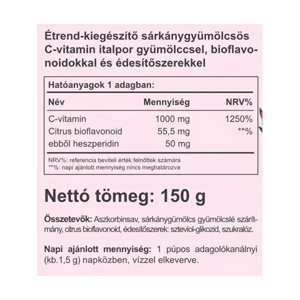 Vi piacciono i sapori esotici? Rinfrescatevi ogni giorno con una bevanda istantanea di vitamina C naturale al gusto di frutto del drago! Assumete la vitamina C di cui il vostro corpo ha bisogno in modo facile e veloce, deliziando al contempo le vostre papille gustative. 1 porzione giornaliera contiene 1000 mg di vitamina C + 55,5 mg di bioflavonoidi di agrumi (di cui esperidina 50 mg) Aromi: estratto di succo di frutto del drago, glicoside steviolico, sucralosio.